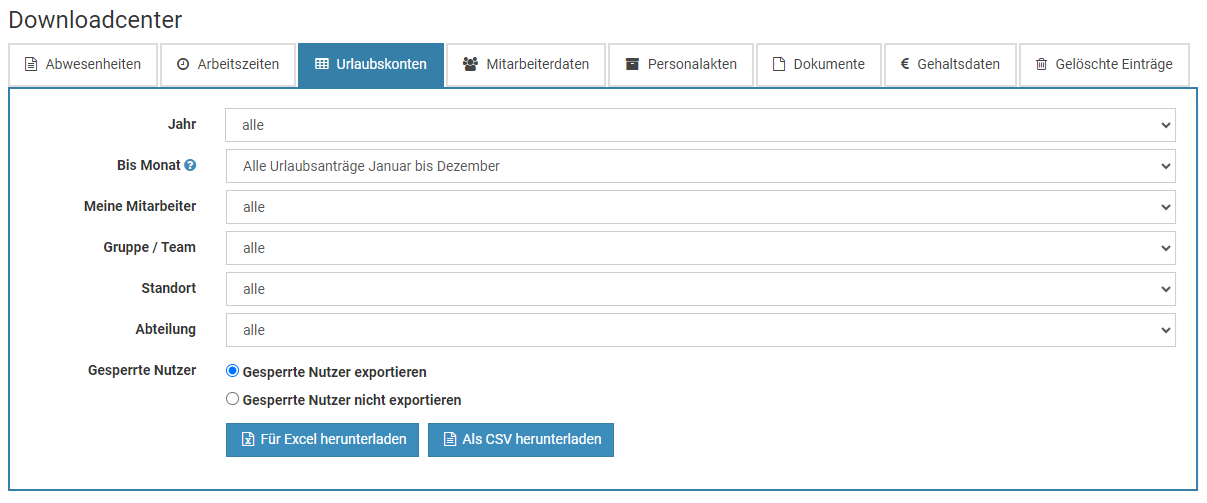 Über das Downloadcenter können die Urlaubskonten der Mitarbeiter bequem mit wenigen Mausklicks als Excel-Datei oder CSV-Datei heruntergeladen werden.