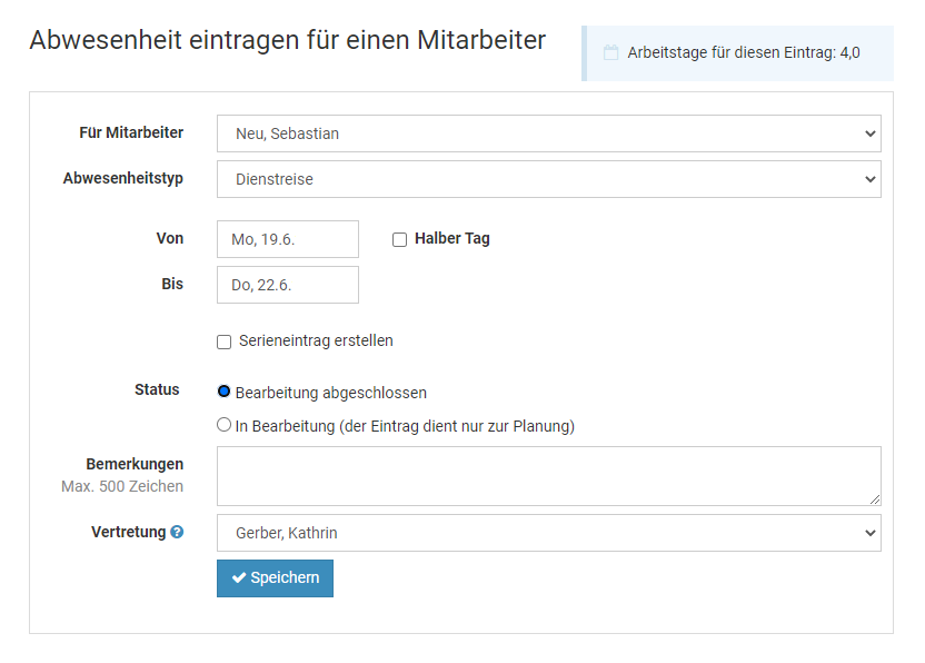 Mitarbeiter > Abwesenheiten > Abwesenheit eintragen". Sie gelangen zu dem Eingabeformular für den Abwesenheitseintrag.