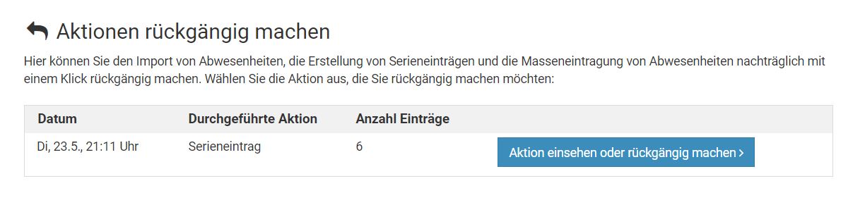 Mitarbeiter-Nutzer und Vorgesetzte erhalten direkt nach der Eintragung der Serieneinträge die Option, die Serieneinträge wieder rückgängig zu machen, also zu löschen. Wenn die Option nicht gewählt wird, dann können die Serieneinträge als ganzes nicht mehr gelöscht werden, sondern es kann nur jeder Eintrag aus der Serie einzeln gelöscht werden.