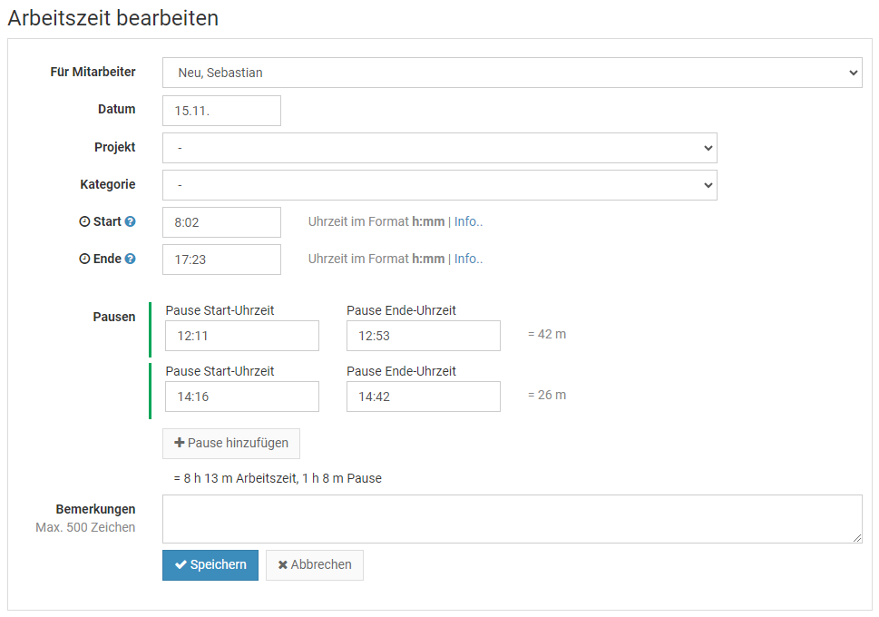 Andere Abwesenheit". Sie gelangen zu dem Eingabeformular, in dem Sie den Abwesenheitseintrag bearbeiten und speichern können.