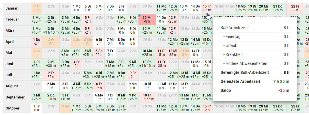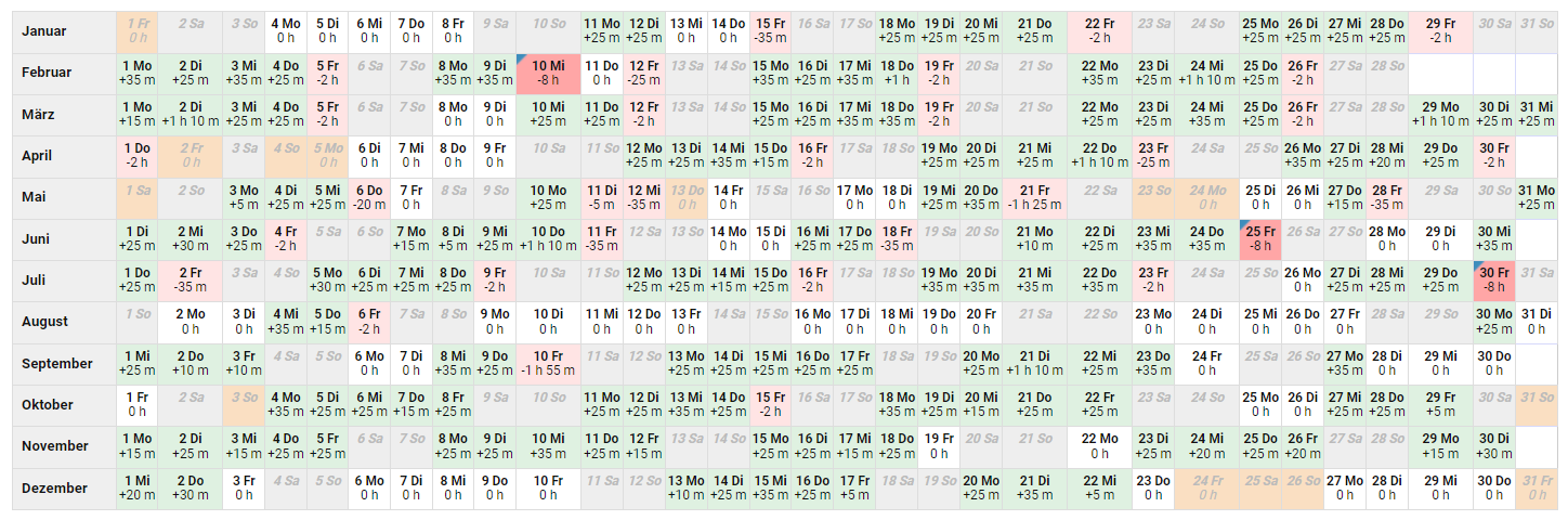 Dazu folgende Beispiele (Annahme: ein Vollzeitmitarbeiter hat Anspruch auf 30 Urlaubstage im Jahr bei einer 5-Tage-Woche zu je 8 Stunden von Montag bis Freitag):