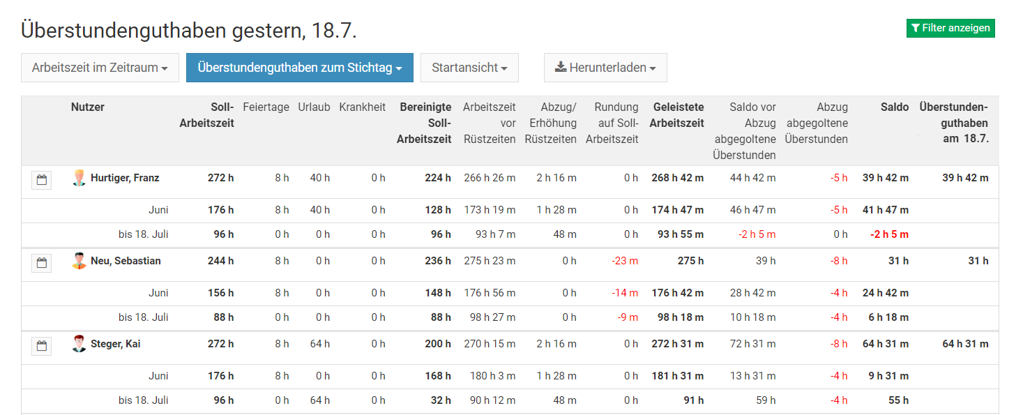Melden Sie sich als Admin am Timebutler an und klicken links oben auf "Mitarbeiter", dann unterhalb der kleinen Überschrift "Mitarbeiter" auf "Übersicht". Sie sehen die Liste aller Nutzerkonten. Klicken Sie rechts oben auf den grünen Button "Filter anzeigen".