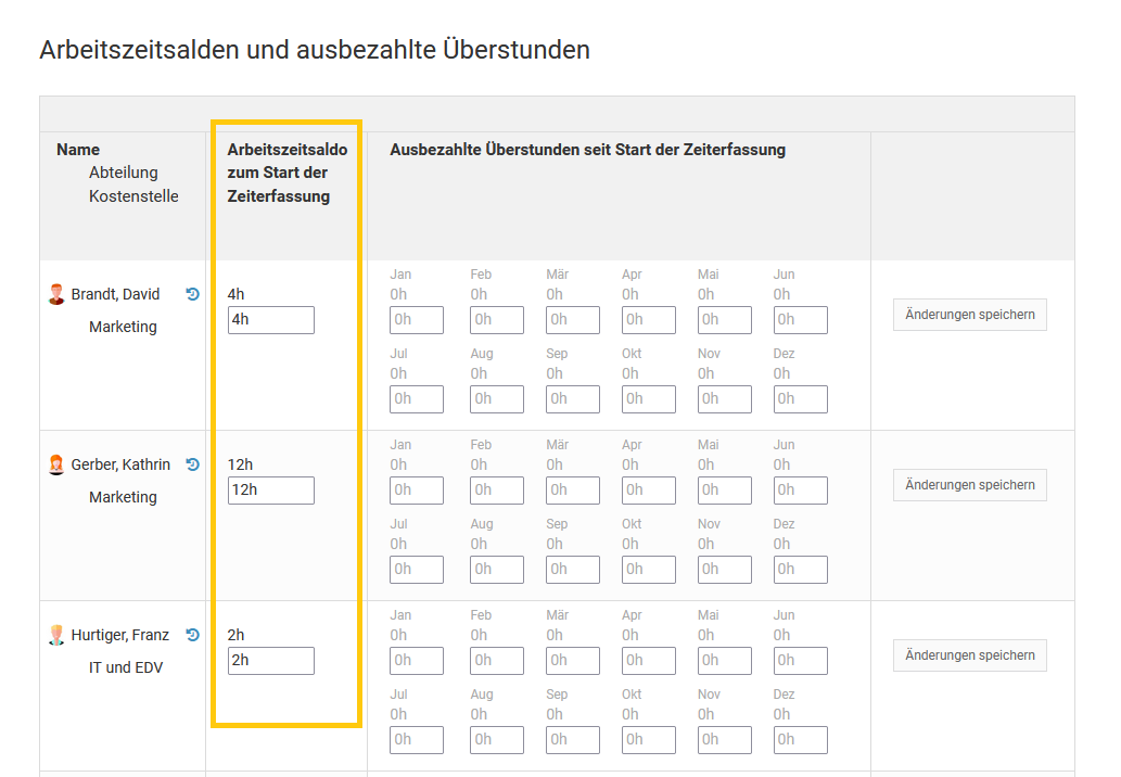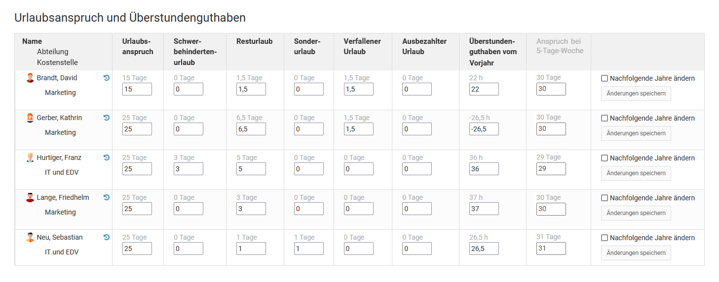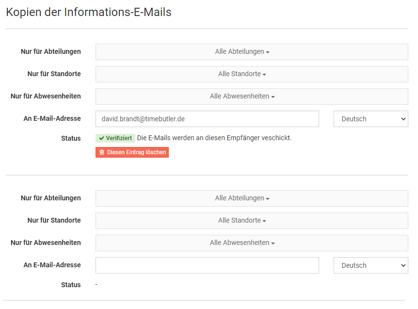 Danach erstellen Sie ein neues Nutzerkonto für den Kollegen mit der gleichen Email-Adresse. Es gibt dann also zwei Nutzerkonten für den einen Mitarbeiter. Ein Nutzerkonto ohne Email-Adresse, bei dem die alten Abwesenheitseinträge und Daten alle weiterhin gespeichert sind und abrufbar sind. Und ein neues Nutzerkonto, an dem sich der Mitarbeiter anmelden kann.