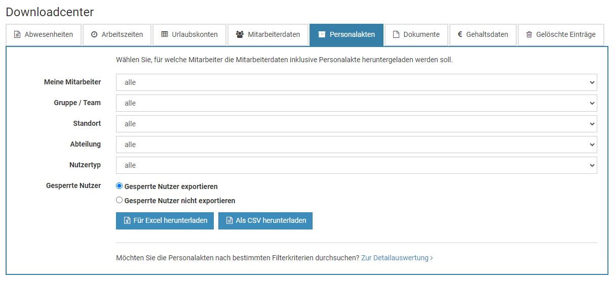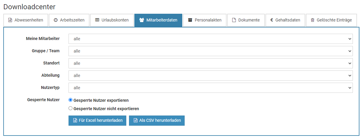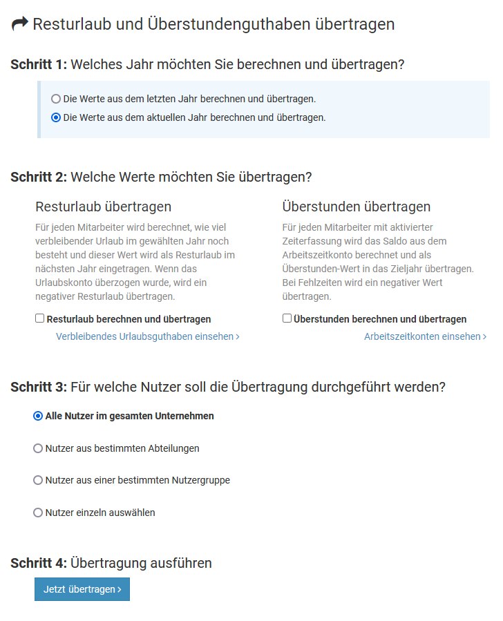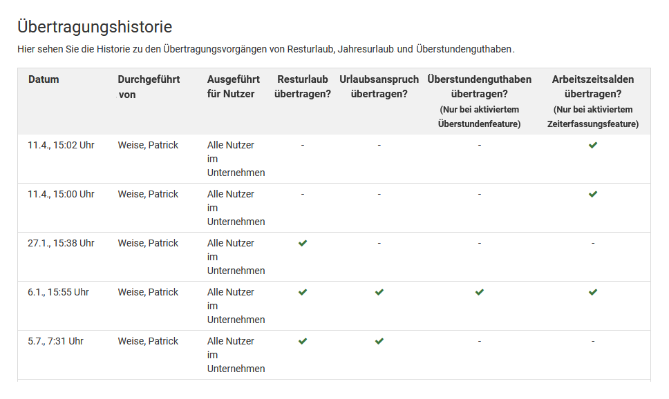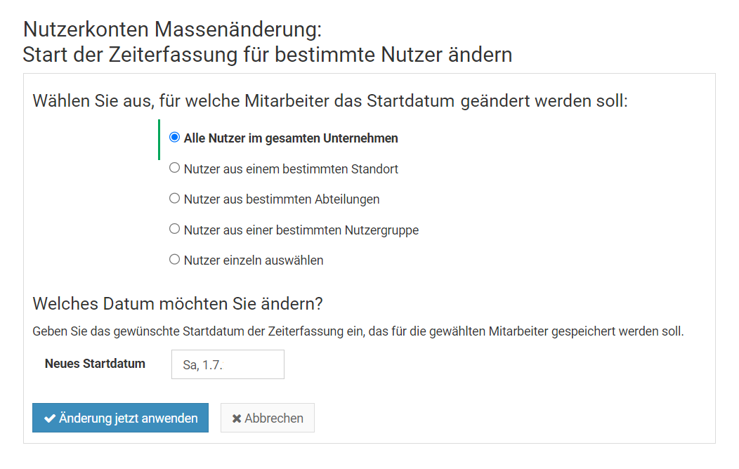 Erstellen Sie für die Mitarbeiter, die aus dem "alten" Nutzerkreis austreten, in dem neuen Ziel-Nutzerkreis die Nutzerkonten neu. Diese Nutzer verwenden ab einem von Ihnen festgelegten Zeitpunkt nur noch den neuen Nutzerkreis, nicht mehr den Alten. Die alten Einträge bis zu diesem Zeitpunkt sind weiterhin im alten Nutzerkreis gespeichert und können dort abgerufen werden.