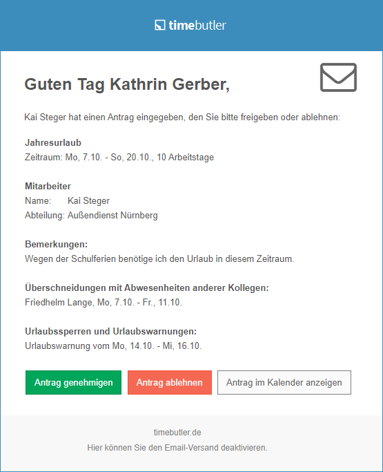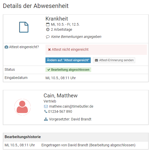 Wenn ein Mitarbeiter einen genehmigungspflichtigen Abwesenheitseintrag eingibt, dann startet Timebutler den Genehmigungsworkflow und benachrichtigt den / die Vorgesetzte(n). Die Genehmigung des Abwesenheitseintrages erfolgt genau wie bei der Genehmigung eines Urlaubsantrages. Lesen Sie hier, wie