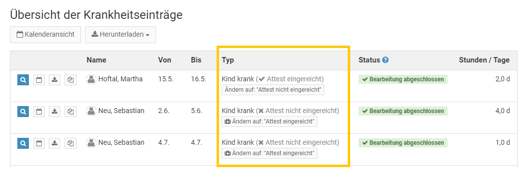 Abwesenheitseinträge im Status "