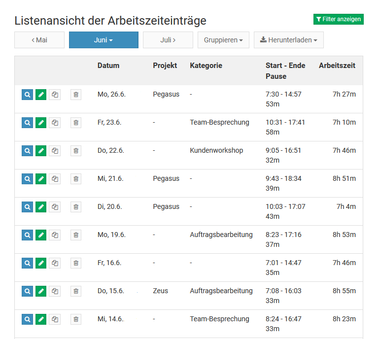 Filter-Button" rechts oben auf der Seite gefiltert werden, um den gewünschten Eintrag schneller zu finden.