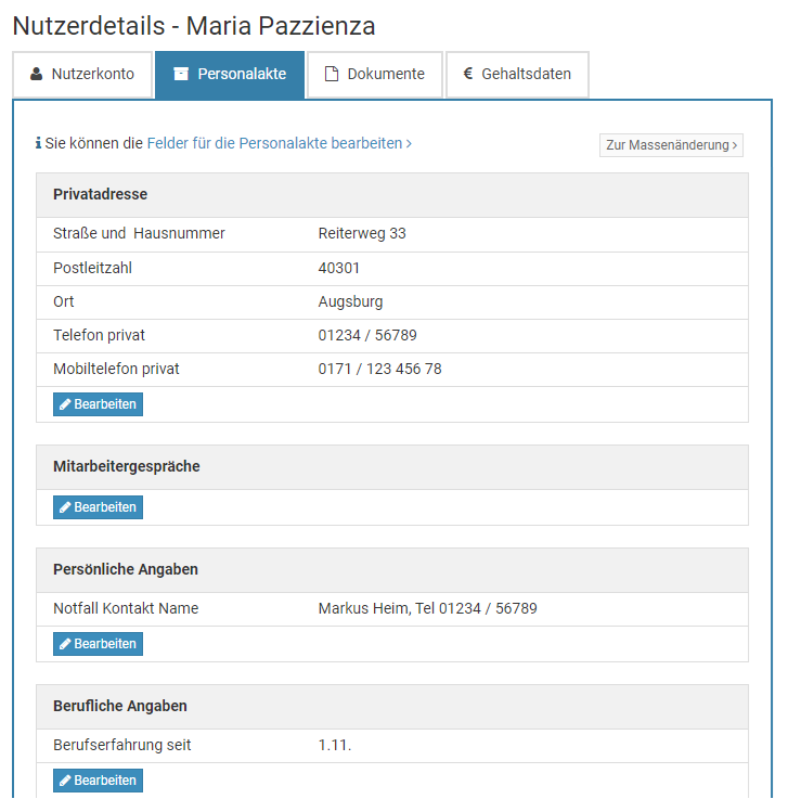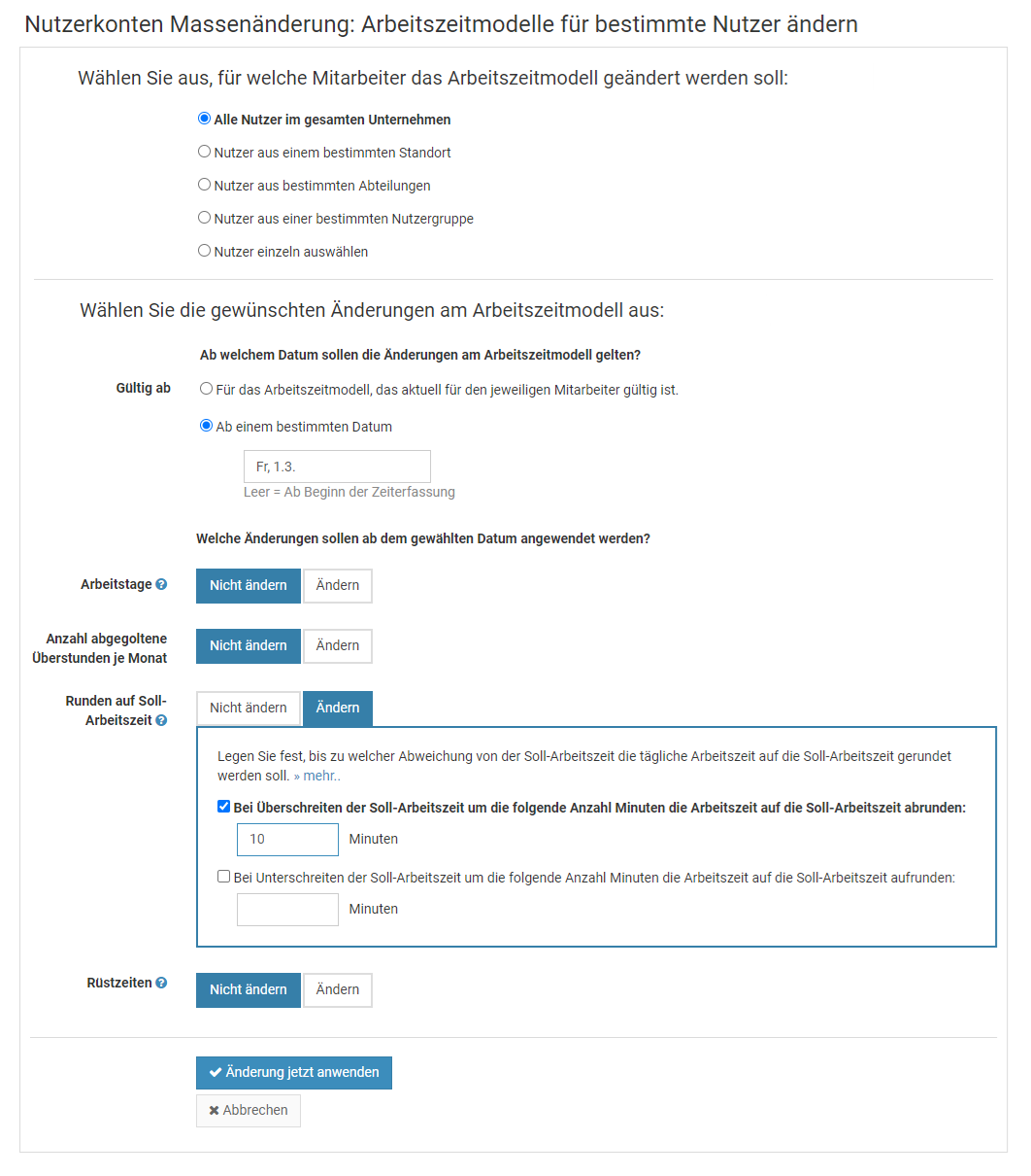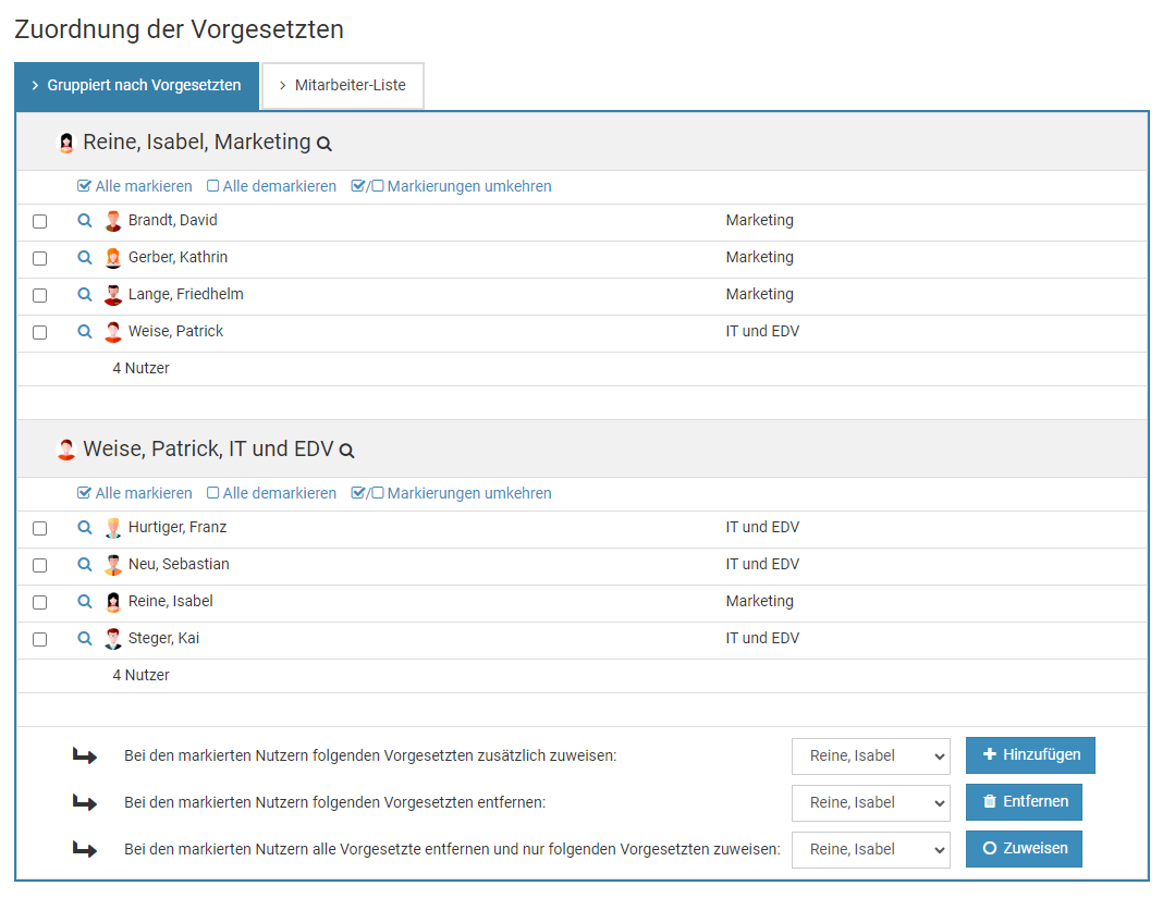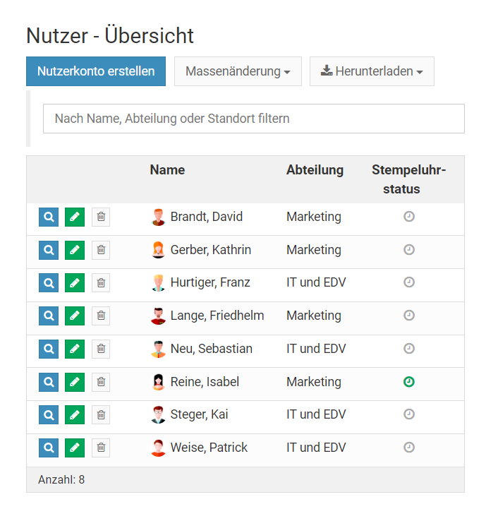 Falls Sie die Abteilung / Standort bei einer Vielzahl an Nutzerkonten ändern möchten, wäre es sehr umständlich, viele Nutzerkonten einzeln bearbeiten zu müssen. Stattdessen gibt es eine Möglichkeit zur Massenänderung.
