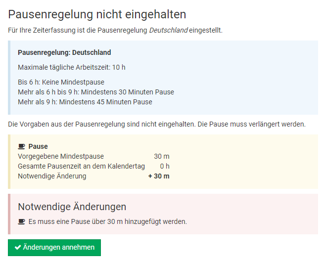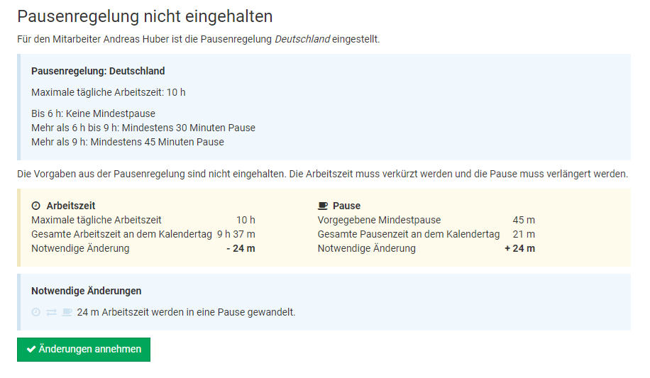 Wenn beispielsweise ein Mitarbeiter einen 2-wöchigen Urlaub eingetragen hat und in der letzten Woche erkrankt, dann gibt der Admin nur den 1-wöchigen Krankheitseintrag ein. Timebutler erkennt, dass sich der Krankheitseintrag mit dem Urlaubsantrag überschneidet und bietet an, den bestehenden Urlaubsantrag automatisch zu kürzen.