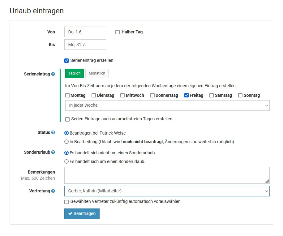 Um einen Serieneintrag für eine Abwesenheit einzugeben, melden Sie sich am Timebutler an und rufen die Eingabemaske für einen neun Abwesenheitseintrag auf (lesen Sie hier, wie Sie zur Eingabemaske für die