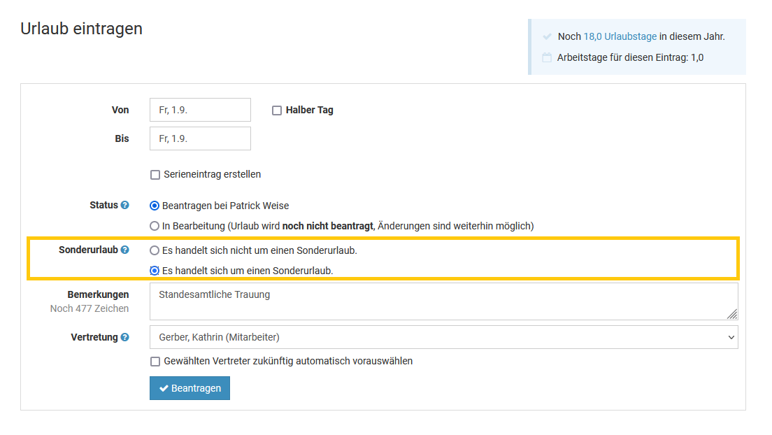 Screenshot: Urlaub als nicht genehmigungspflichtig einstellen