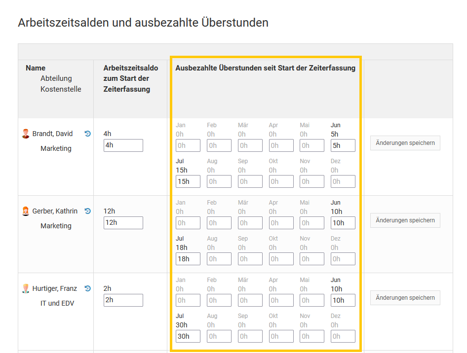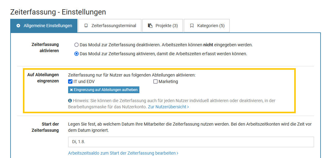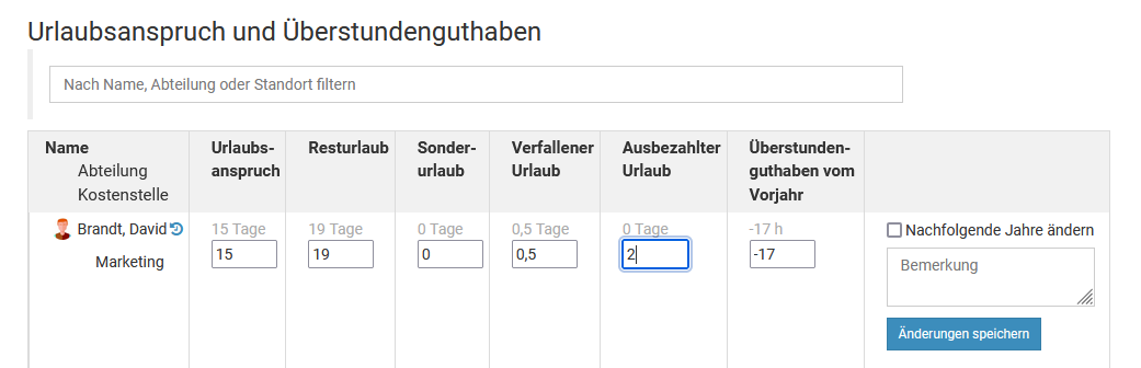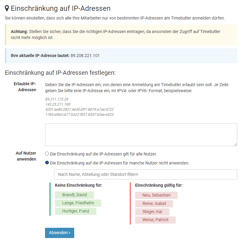 Timebutler ermittelt die Liste der Abteilungen und Standorte automatisch aus den Angaben, die Sie in den Feldern "Abteilung" und "Standort" in den Nutzerkonten eingeben. Es gibt also keine zentrale Stelle, um die Liste er Abteilungen und Standorte zu verwalten.
