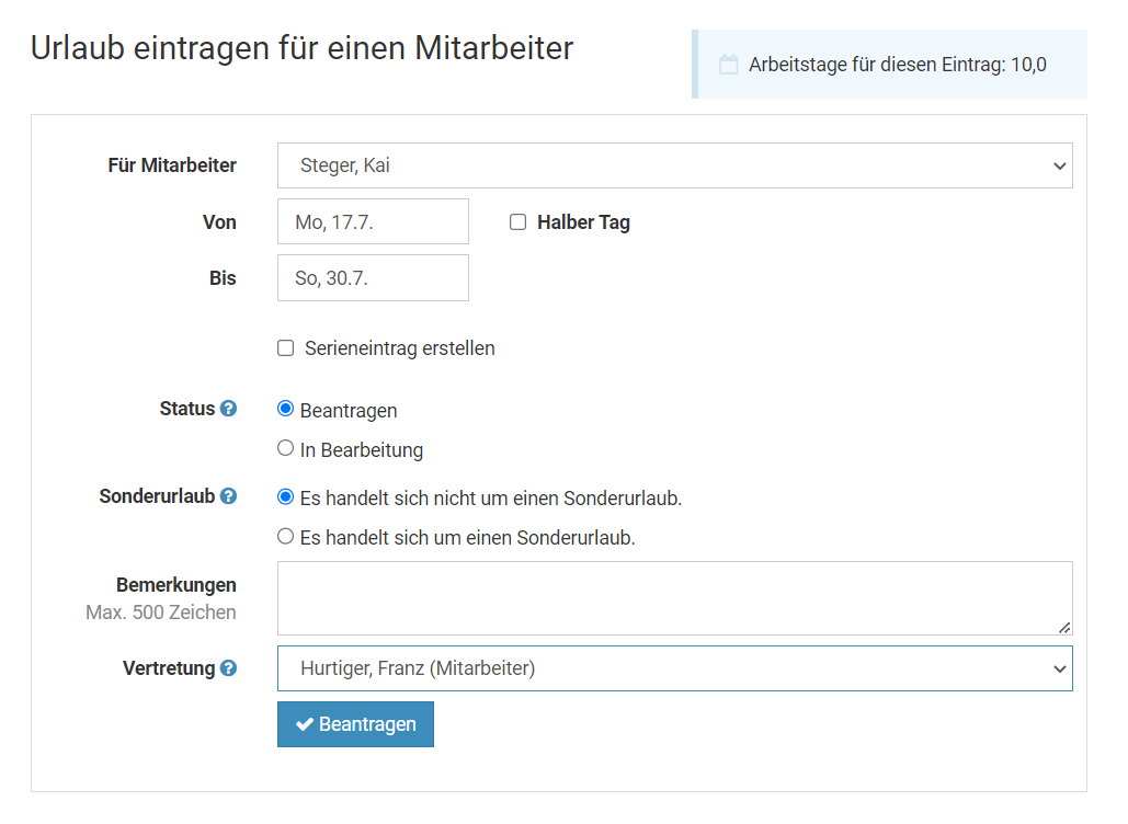 Bei der Eingabe einer Abwesenheit kann auch ein Vertreter ausgewählt werden. Es ist hier nicht möglich, mehrere Vertreter auszuwählen, sondern es kann nur ein Vertreter gewählt werden.