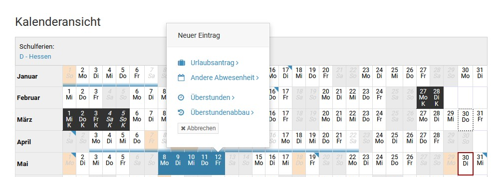 Abwesenheiten > Kalenderansicht". Klicken Sie dann auf den ersten Tag, an dem der Abwesenheitseintrag starten soll und dann auf den Tag, an dem der Abwesenheitseintrag enden soll. Es erscheint ein kleines Auswahlfenster. Klicken Sie darin auf "